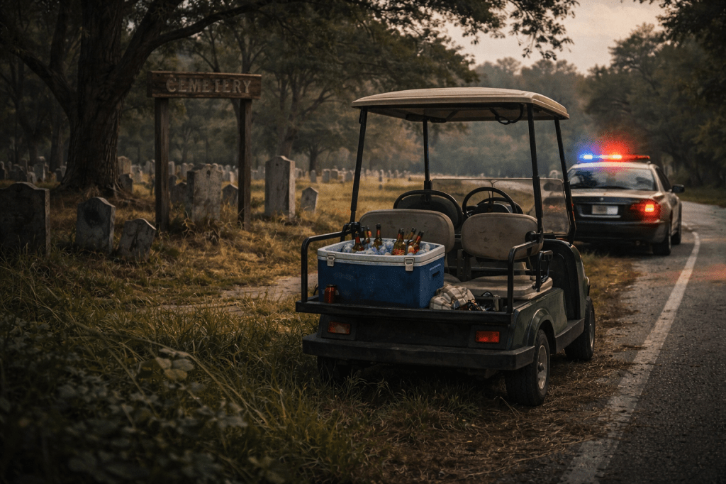 That was the exact moment I started mentally drafting how I was going to tell my fiancé that I would be spending Easter weekend in a holding cell, waiting for my first appearance before a judge on Monday morning, all because I wanted cemetery pictures from an illegal golf cart I was not even driving.
